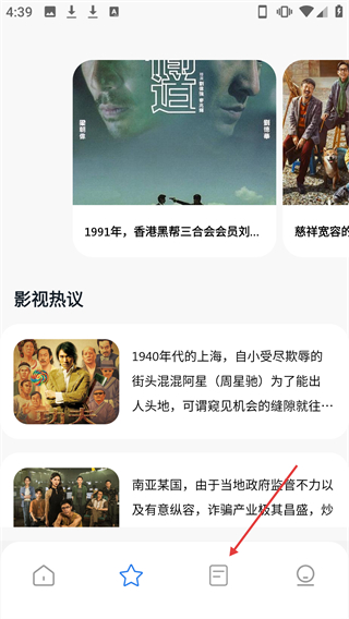 1、在【影视热议】页面浏览内容后,点击底部第三个图标可进入对应功能页。