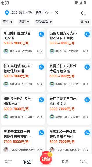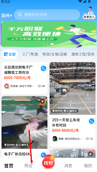 1、进入首页后点击“附近”入口,查看周边招聘信息和职位分布。