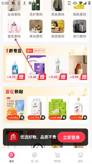 1、在首页点击【香氛惠购】分类,可进入香氛类商品的专区页面。