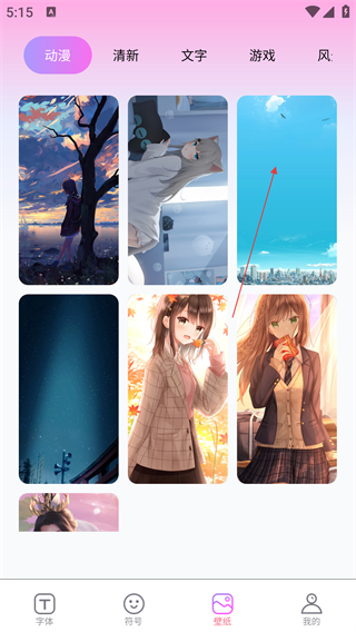 3、在壁纸页面,选择目标分类(如“动漫”)下的壁纸样式,进入该壁纸的预览界面。