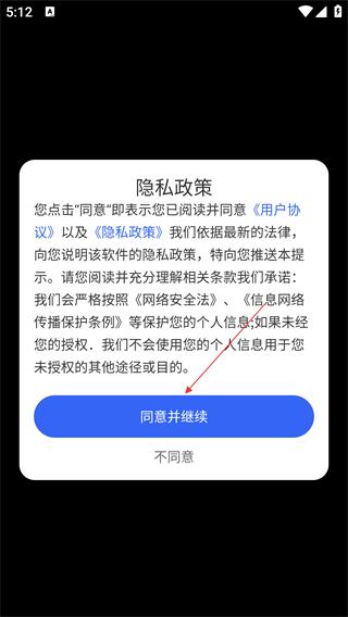 1、在应用启动后的【隐私政策】弹窗中,点击【同意并继续】按钮,进入应用主界面。
