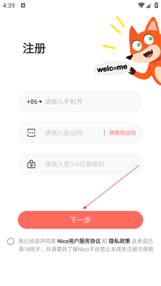 3、在注册页面填写手机号、验证码及密码,勾选协议后点击【下一步】,进入完善信息页面。