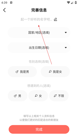 4、在完善信息页面填写昵称、地区等信息,选择性别及匹配偏好后,点击【完成】即可完成注册流程。