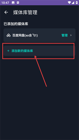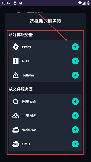 2、进入媒体库管理界面后,点击【添加新的媒体库】选项,可打开服务器选择界面,挑选要添加的媒体源类型哦。