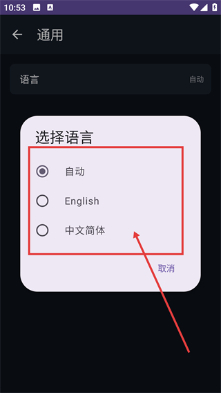 4、在语言选择弹窗里,可选择【自动】【English】【中文简体】等选项,选好后就能应用对应语言啦。