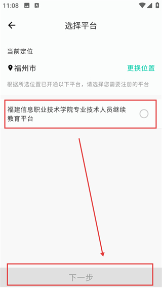 3、进入选择平台界面后,选择目标平台(如福建信息职业技术学院相关平台),点击【下一步】按钮,继续注册流程呀。