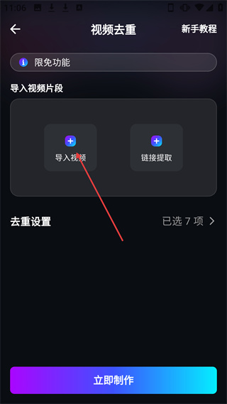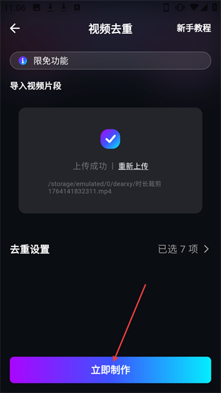 4、在【视频去重】页面,完成视频上传后,点击底部的【立即制作】按钮即可启动视频去重操作。