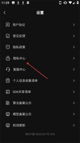2、在设置页面选择【隐私中心】选项,即可进入隐私中心页面。