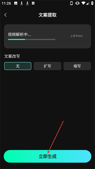 4、在【文案提取】页面,待【视频解析中...】完成后,点击底部【立即生成】按钮即可生成对应文案。