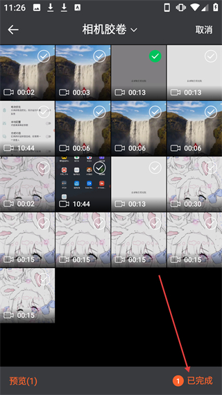 3、在【相机胶卷】页面选定目标内容后,页面底部会显示【已完成】提示。
