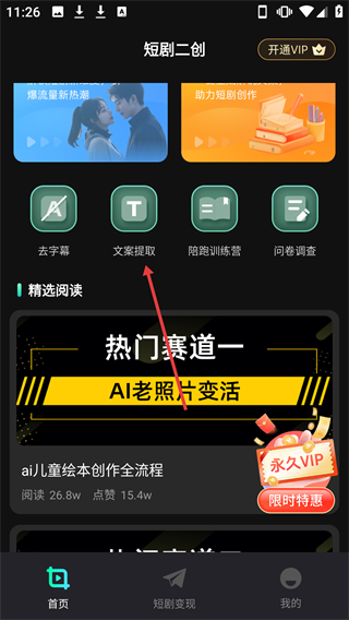 1、在【短剧二创】页面,点击【文案提取】功能按钮,可进入对应的文案提取操作页面。