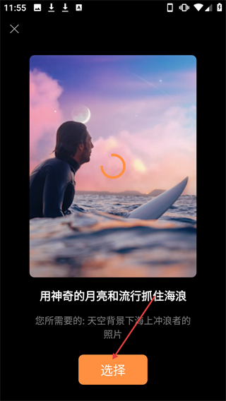 2、进入【仙境天空】效果详情页后,点击底部【选择】按钮,即可选取个人照片来应用此特效。