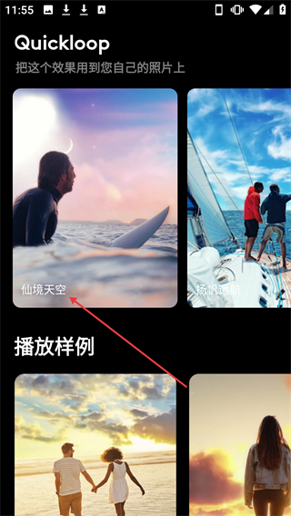 1、在【Quickloop】页面选择【仙境天空】效果,可将该特效应用到自己的照片上。