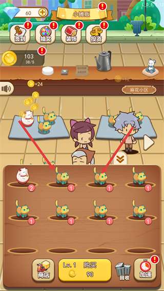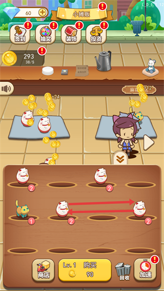3、将相同等级的物品(如小猫)进行合成,可升级为更高收益的物品(如招财猫),同时获取更多金币收益。