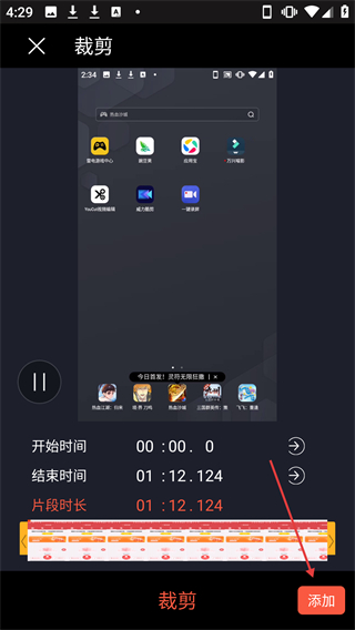 4、在裁剪页面设置好片段时长后,点击【添加】按钮,可将该视频片段添加到制作轨道。