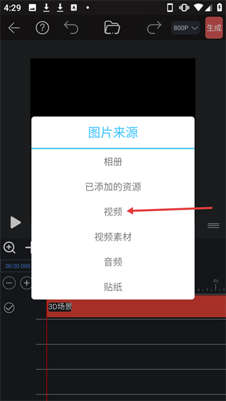 3、在【图片来源】弹窗中选择【视频】选项,可进入视频裁剪页面。