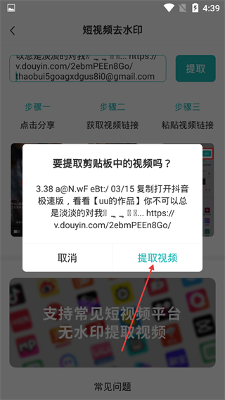 3、弹出【要提取剪贴板中的视频吗?】的确认弹窗后,点击【提取视频】按钮,可启动无水印视频的提取流程。