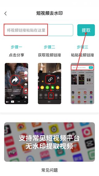 2、在【短视频去水印】页面,将视频链接粘贴至【将视频链接粘贴在这里】输入框,即可准备提取无水印视频。