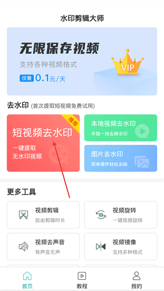 1、在【水印剪辑大师】首页,点击【短视频去水印】按钮,可进入该功能的操作页面。