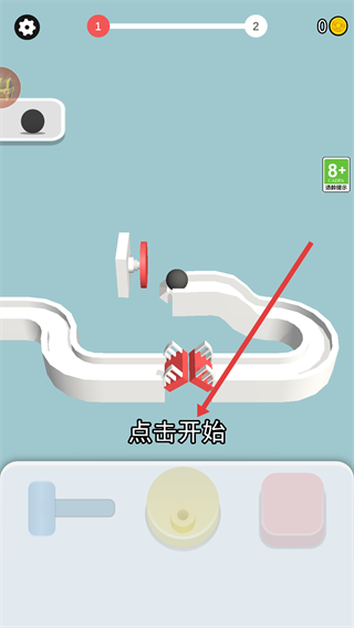 1、在该关卡界面,点击“点击开始”按钮,启动小球在轨道上的移动流程,推进该关卡的游玩进度。