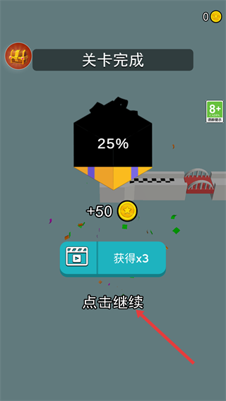 4、关卡完成后,点击“点击继续”按钮,结算50金币的奖励,同时进入后续的关卡游玩流程。