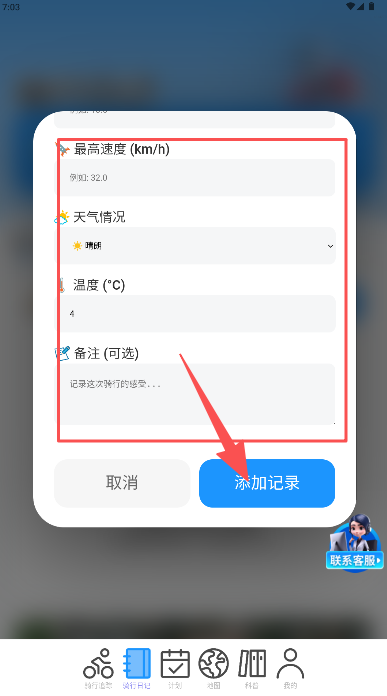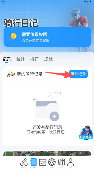 2、在骑行日记页点击“添加记录”按钮手动输入本次骑行数据。