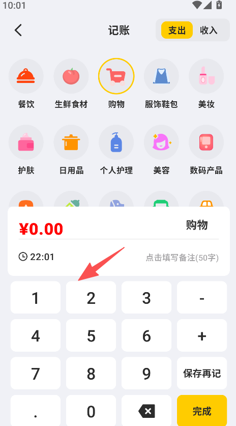 3、提供金额输入与记录功能,选择分类后通过数字键盘输入金额,填写备注后点击完成,完成日常消费的记录操作。