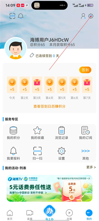 1、在【海博TV】首页,点击底部【我的】进入个人中心,可查看积分、签到及服务专区等功能模块。