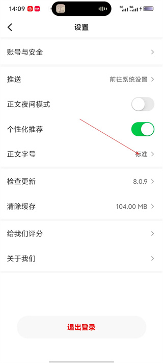 3、在【设置】页面,点击【正文字号】选项,可进入字号设置界面,调整新闻正文的字体大小。