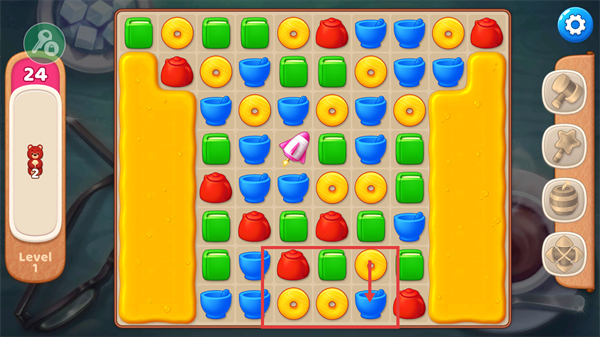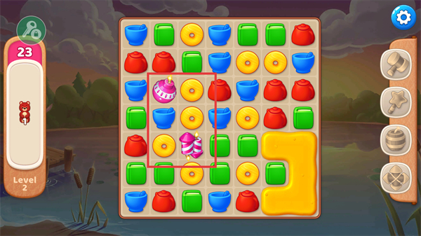 1、进入游戏关卡之后,匹配相邻的同色元素(如红色块),可触发对应消除效果,要留意剩余步数,推进关卡进程。