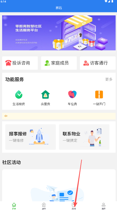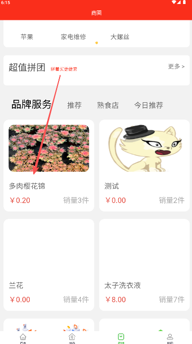 1、在首页“商圈”进入页面浏览商品分类与拼团活动。