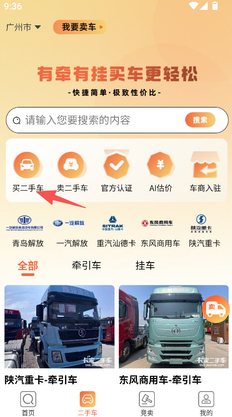 1、聚焦二手商用车交易场景,设买、卖二手车等功能,含官方认证、AI估价板块,适配商用车交易需求,提升交易定向性与操作适配性。
