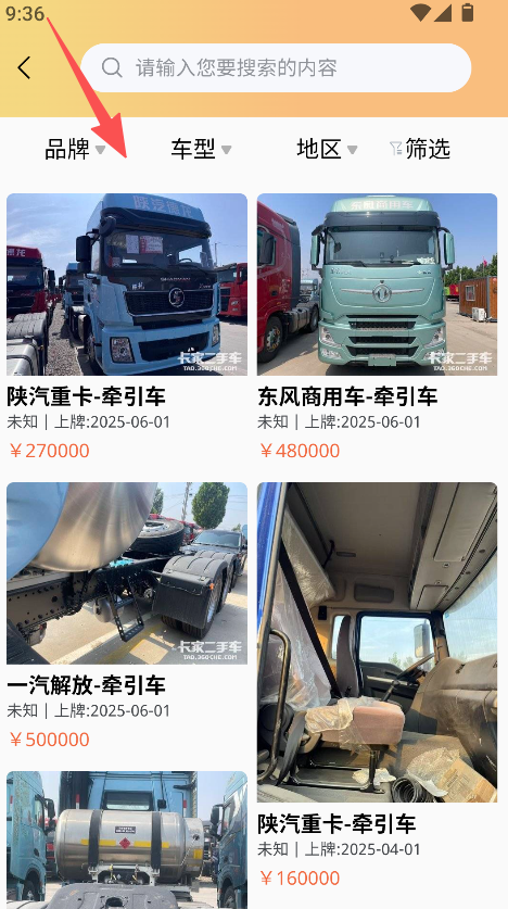 3、筛选维度丰富适配需求,可按品牌、车型、地区筛选车辆,细化交易搜索方向,提升商用车交易的精准性与效率。
