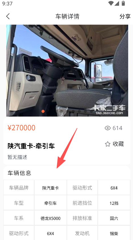 3、选择目标车辆,查看车辆详情,获取品牌、驱动形式等信息,辅助二手商用车交易的决策与信息确认。