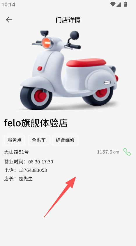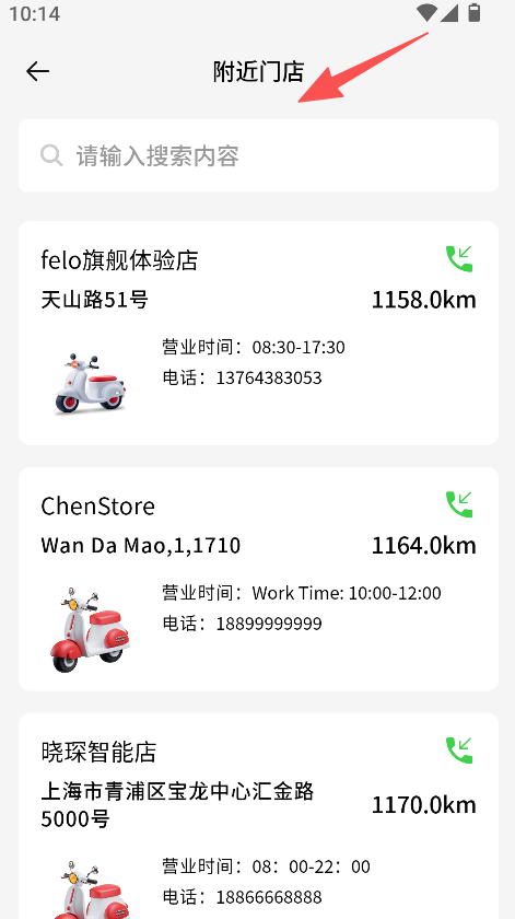 2、进入附近门店页面,查询周边门店信息,获取门店地址、电话等内容,匹配车辆配套服务的查找需求。