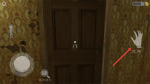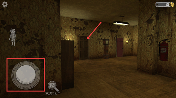 1、在大厅场景中,通过左侧虚拟摇杆控制角色移动,优先靠近门的位置,探索不同房间以收集解谜道具,同时注意躲避修女的追踪。