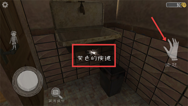 3、在洗手池区域找到“黄色的按键”,点击“拾起”收集该道具,这类按键是解锁暗门、机关的关键物品,需妥善保存。