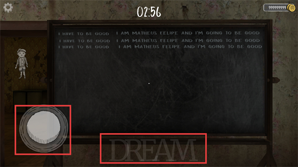 2、初始场景中,黑板上的重复文字是剧情线索,通过左侧虚拟摇杆移动角色,优先探索场景中的可交互物品(如字母道具)。