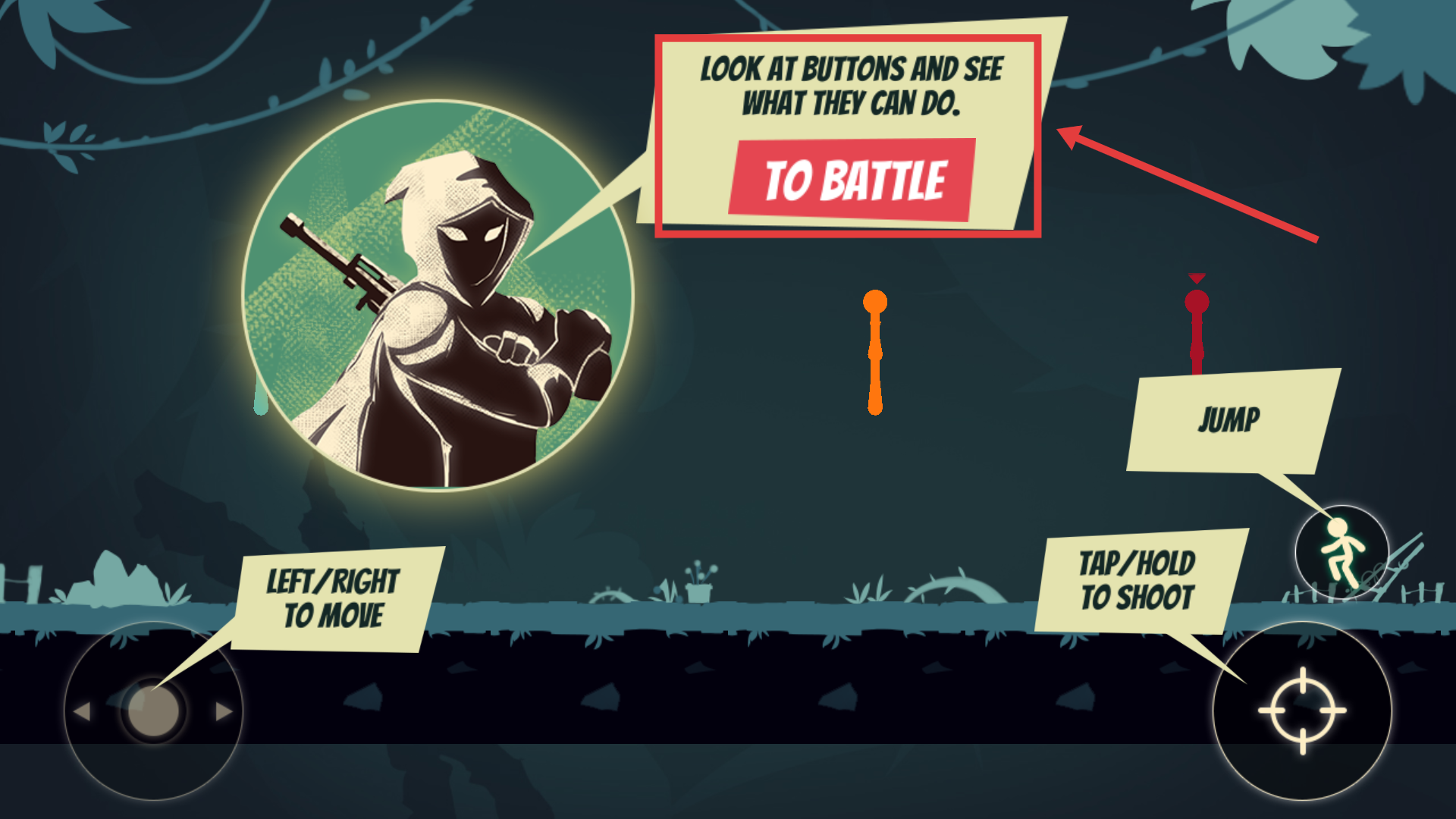 1、进入游戏后先熟悉【LEFT/RIGHTTOMOVE】【JUMP】等按钮功能,点击【TOBATTLE】开启战斗,为后续操作打好基础。