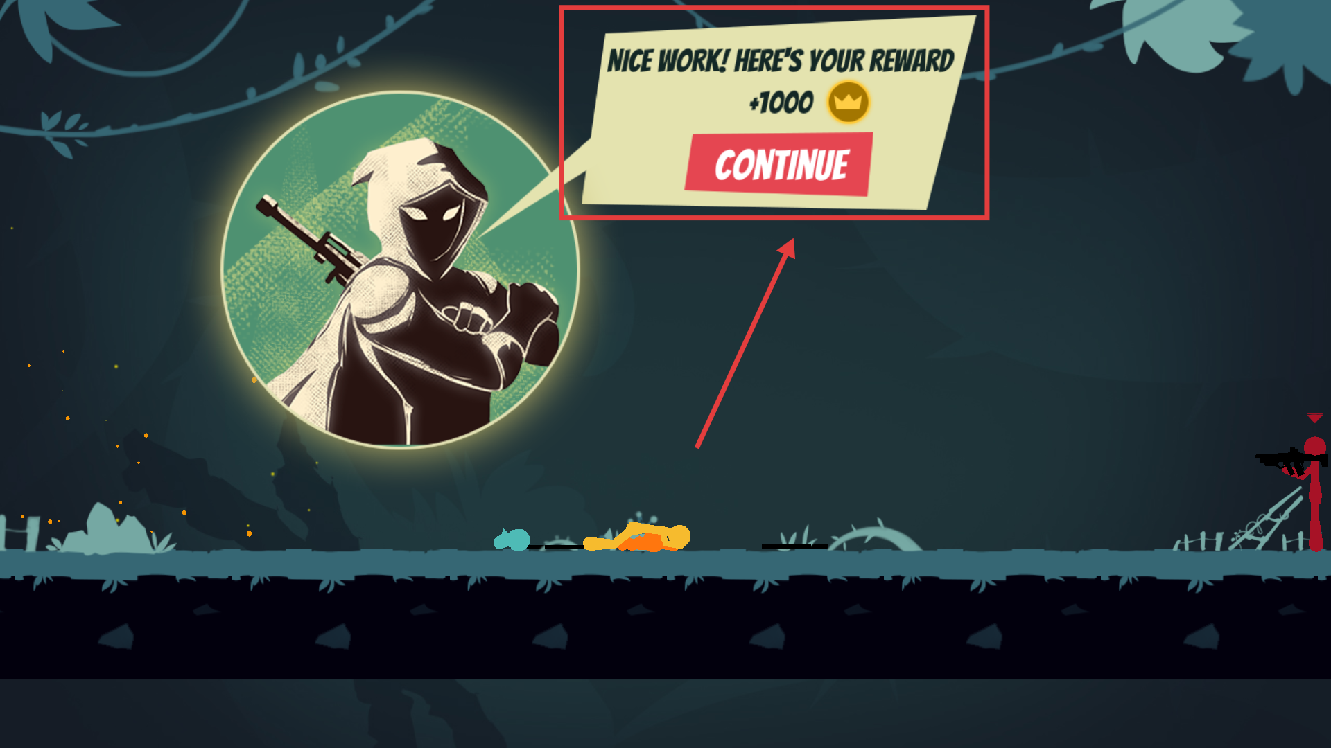 4、完成战斗后会获得【+1000】金币奖励,点击【CONTINUE】按钮继续游戏,积累资源解锁更多武器和关卡。