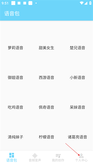 2、进入应用后在【语音包】页面,可选择【萝莉语音】【甜美女生】等多种语音类型,选好后点击底部【个人中心】进入对应页面。