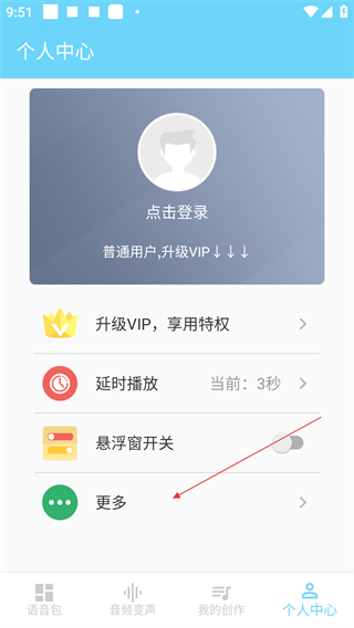 3、在【个人中心】页面,可操作【升级VIP】【延时播放】等功能,点击页面中的【更多】选项,进入更多功能设置界面。