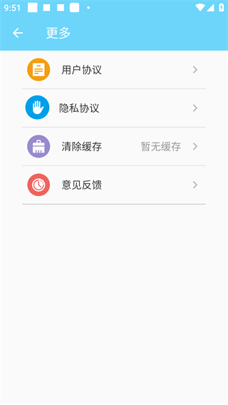 4、进入【更多】页面后,可查看【用户协议】【隐私协议】,也能进行【清除缓存】【意见反馈】等操作,按需选择对应功能即可。