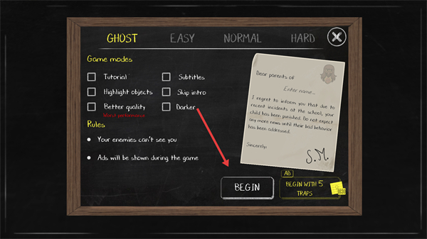 1、选择“(幽灵)”模式,该模式下敌人无法看到你,适合新手熟悉场景;点击“BEGIN”进入关卡,可先探索场景收集道具。