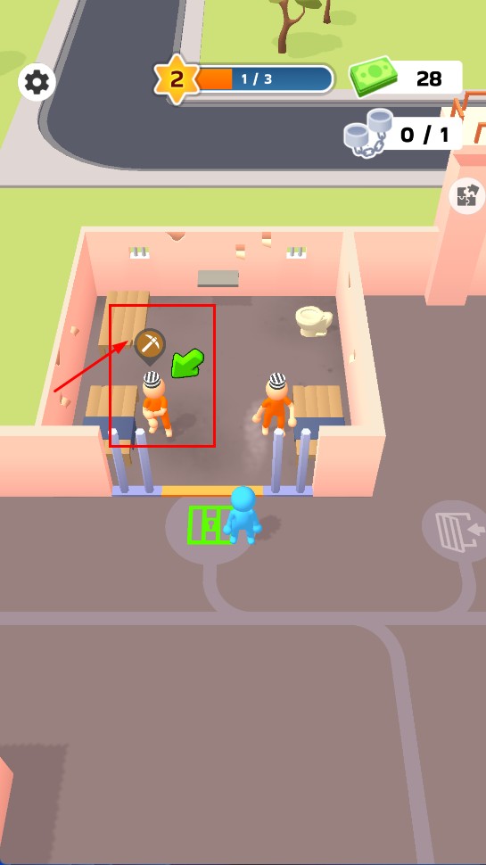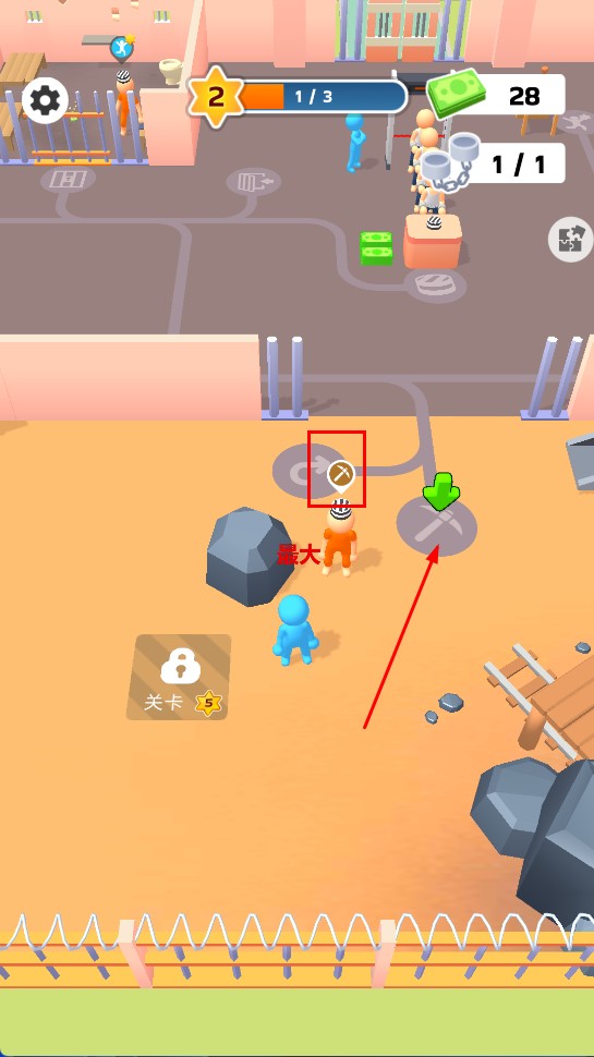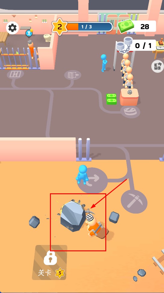 2、引导囚犯前往户外箭头位置处理【石头】,完成任务解锁新关卡扩展监狱可操作区域提升空间。