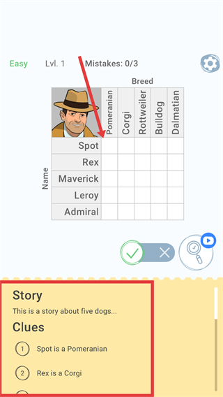 2、在【Easy-Lvl-1】场景,查看【Clues】中的提示,对应【Name】与【Breed】的匹配关系开始推理。