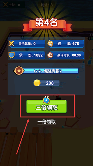 4、战斗结束后查看【击杀数量】【输出】等数据,选择【三倍领取】获取更多金币提升等级。