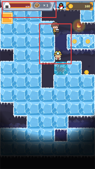 1、操控角色在冰面场景移动,优先收集金币类道具,同时注意避开火焰陷阱,冰面砖块可推动,需规划移动路径。