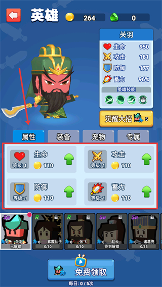 1、升级【生命】【攻击】【防御】【蓄力】属性,消耗【金币】提升英雄战力,增强对战生存与输出能力。