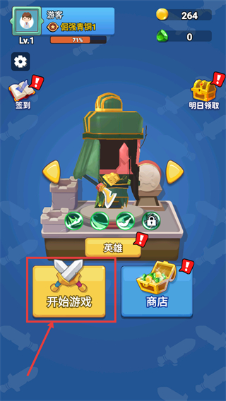 2、点击【开始游戏】进入战斗,可先完成【签到】获取奖励,利用资源提升英雄再参与乱斗。